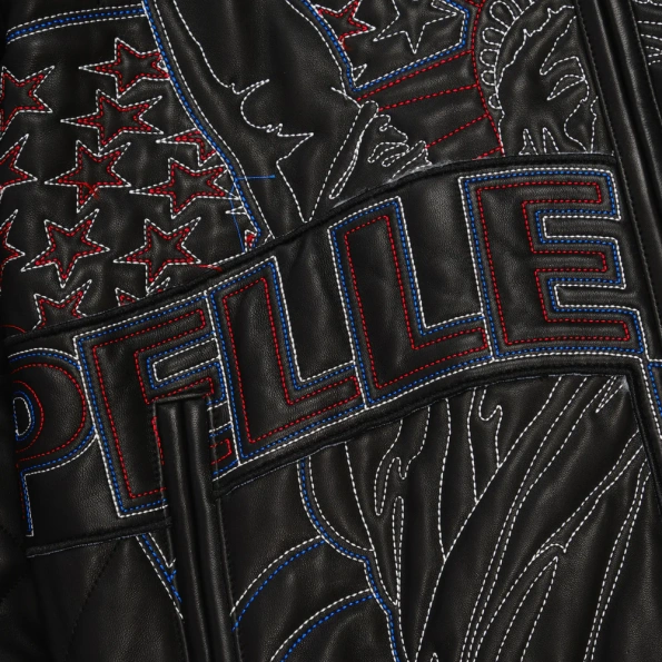 Featuring contrast-colored quilted artwork inspired by America’s landmarks and culture, this jacket tells a story of creativity, freedom, and individuality. The artwork stretches across the front, back, and sleeves turning every angle into a masterpiece. The embroidered Pelle Pelle outline on the satin lining reinforces authenticity and craftsmanship synonymous with the brand.