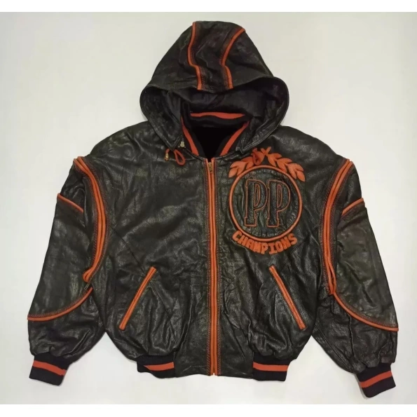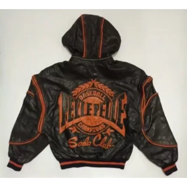 PELLE PELLE BASEBALL CHAMPION JACKET Champion style meets rebellious attitude in this Pelle Pelle leather jacket. Its buttery soft black leather shell is accented by vibrant Black Hoodie sleeves and collar for a look that demands attention. Rib-knit cuffs keep out the chill while a shirt-style collar adds a touch of casual cool. Pelle Pelle imbues all their pieces with an irreverent spirit, and this moto jacket is no exception. In a sea of black leather, this champion stands out from the crowd with its fearless color combo and premium details. For guys who like to push boundaries and stand out from the pack, this jacket announces your rebel status for all the world to see. After all, real champions blaze their own trail.