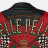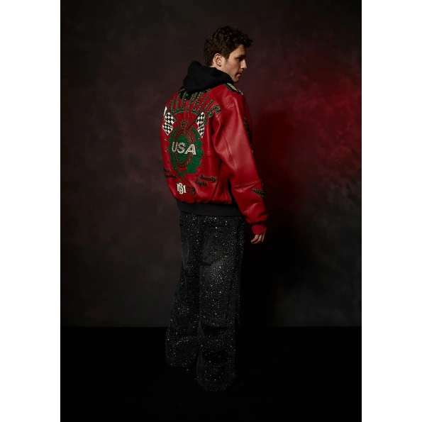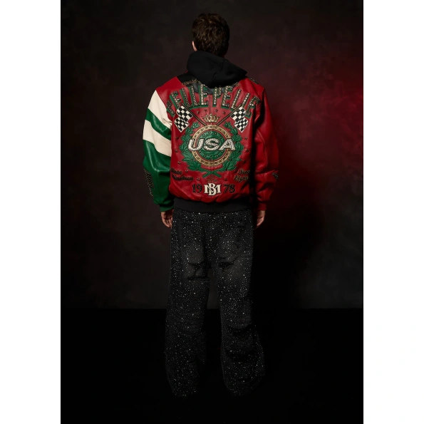 On the back, a large checkered flag graphic takes center stage, made with multi-layered metallic leather, rhinestones, and intricate stitching a Pelle Pelle signature that celebrates craftsmanship and bold individuality.