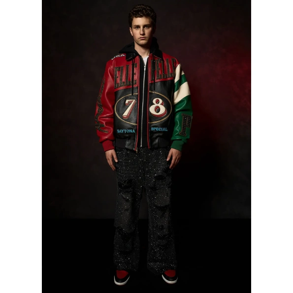 This jacket channels the pulse of speed and adrenaline. The oversized “Pelle Pelle 78” appliqué across the chest is accented with rhinestones that shimmer under any light, while the contrast color sleeve features authentic racing stripes paying tribute to motorsport heritage.