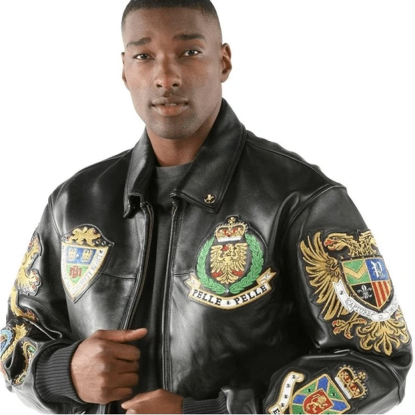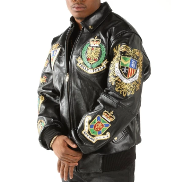 PELLE PELLE DECORATED BLACK LEATHER JACKET This black leather jacket from Pelle Pelle is the perfect addition to your outfit. It is made of genuine leather and features a shirt-style collar and open zipper closure. PELLE PELLE Its viscose lining makes it comfortable for all day wear. Stay warm and be the envy of all with this sophisticated, luxurious PELLE PELLE LEATHER JACKET.