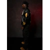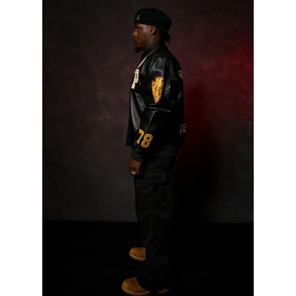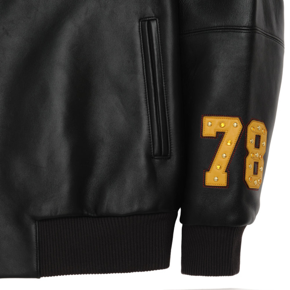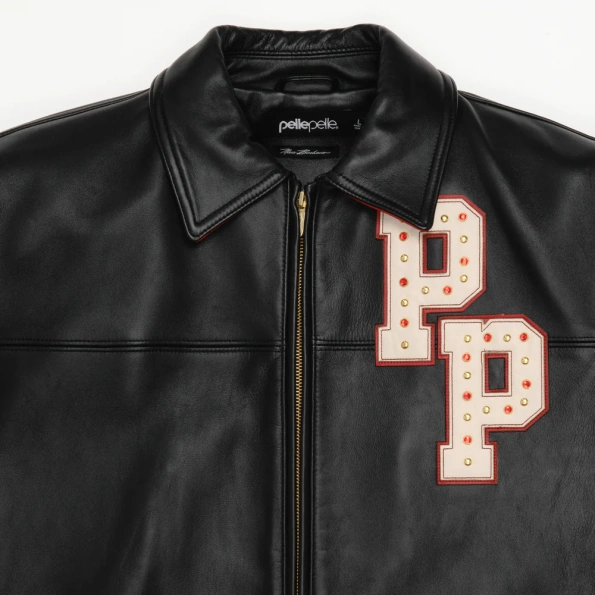 The Black, Ivory, and Cabernet color palette gives this jacket a commanding presence. The contrast leather sleeves and striped detailing on the right sleeve add depth and athletic flair. Adorned with studded leather artworks and rhinestone accents, it embodies Pelle Pelle’s legendary mix of artistry and attitude.