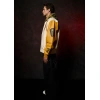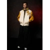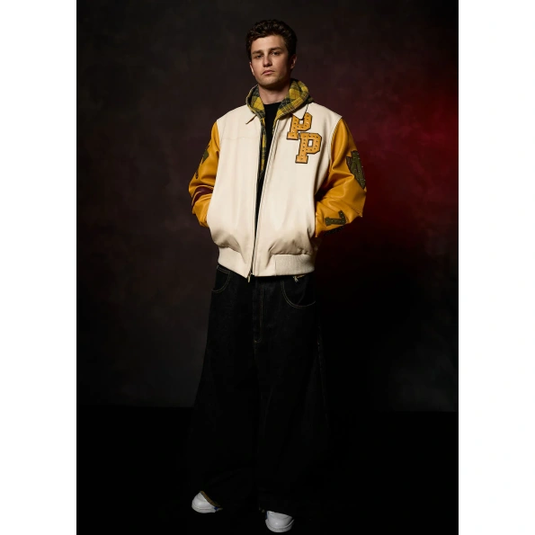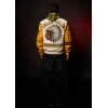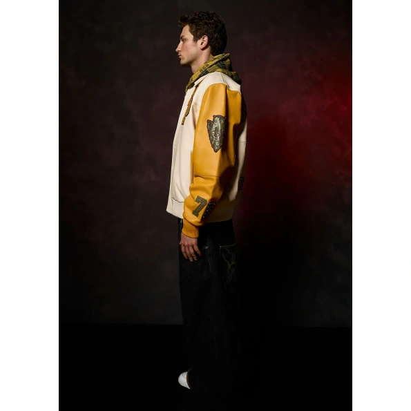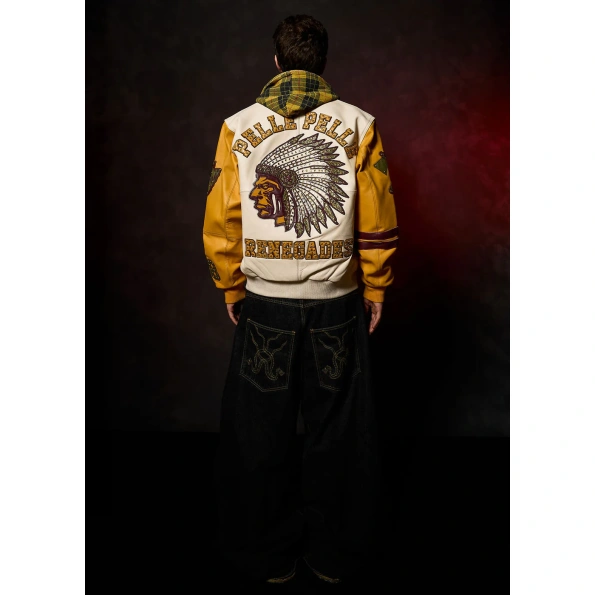 This striking jacket features a rich Ivory, Maize, and Burgundy color combination that commands attention. The contrast leather sleeves and applied striping on the right arm give it a vibrant, athletic look, while the multiple leather artworks with studs and rhinestones bring out a sense of bold sophistication. Every inch celebrates craftsmanship, confidence, and creativity the hallmarks of Pelle Pelle’s timeless appeal.